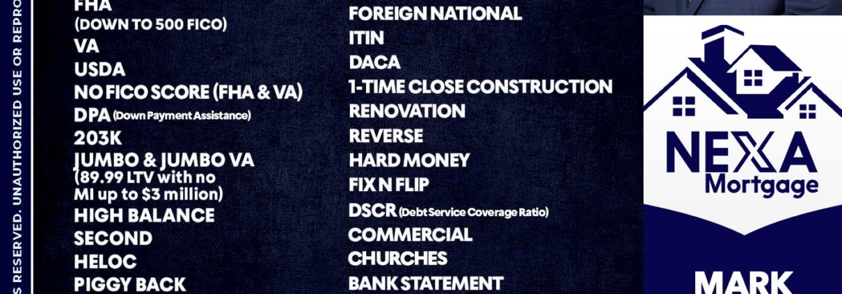 Hi, my name is Mark Harris. I’m a Loan Officer with NEXA Mortgage LLC., offering personalized mortgage solutions, fast customized quotes, great rates and service with integrity.