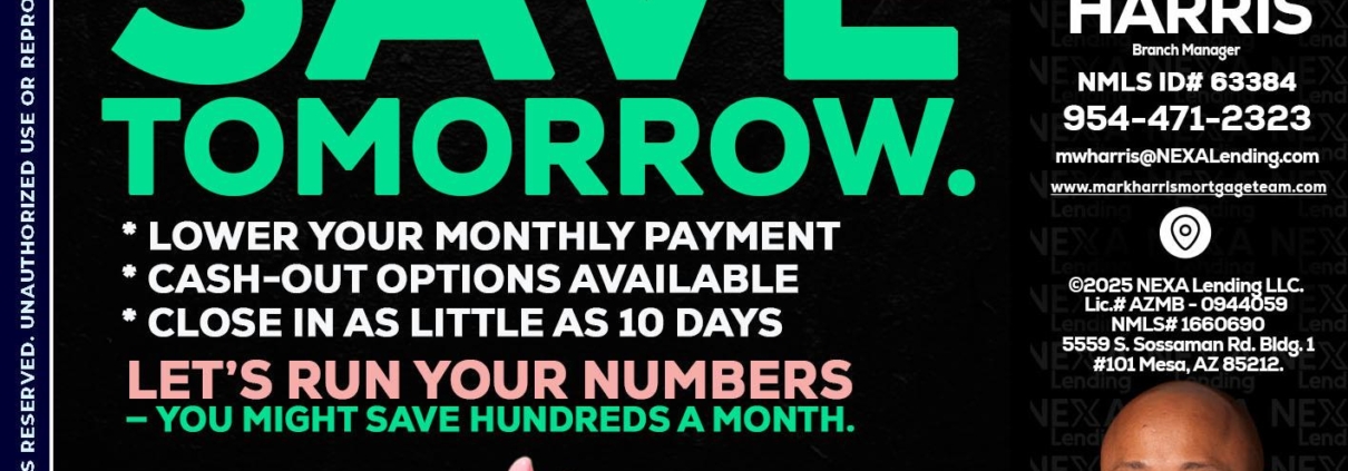REFI TODAY SAVE TOMORROW - Mark Harris -Loan OfficerHi, my name is Mark Harris. I’m a Loan Officer with NEXA Mortgage LLC., offering personalized mortgage solutions, fast customized quotes, great rates and service with integrity.